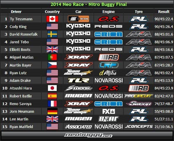 יניב סיוןטיי טסמן הקנדי מנצח את מירוץ הניו באגי 2014 בשתי הקטגוריות ניטרו וחשמל , מדובר באחד המירוצים היוקרתים ביותר בעולם אחרי אליפות העולם. שני קודי קינג עם הקיושו MP9 TKI 3 אלוף העולם 2010 שנתן תצוגת נהיגה יוצאת מן הכלל רק 4 שניות הבדל לאחר 45 דקות של גמר אגדי ושלישי דוויד רונפלק אלוף אירופה גם עם הקיושו MP9 TKI , רביעי ג’ארד טיבו עם הקיושו MP9 TKI 3 לאחר שניצח ברציפות בחמש השנים האחרונות! השג שבספק משהו יתקרב אליו.