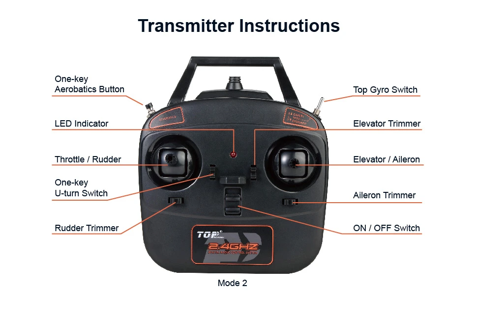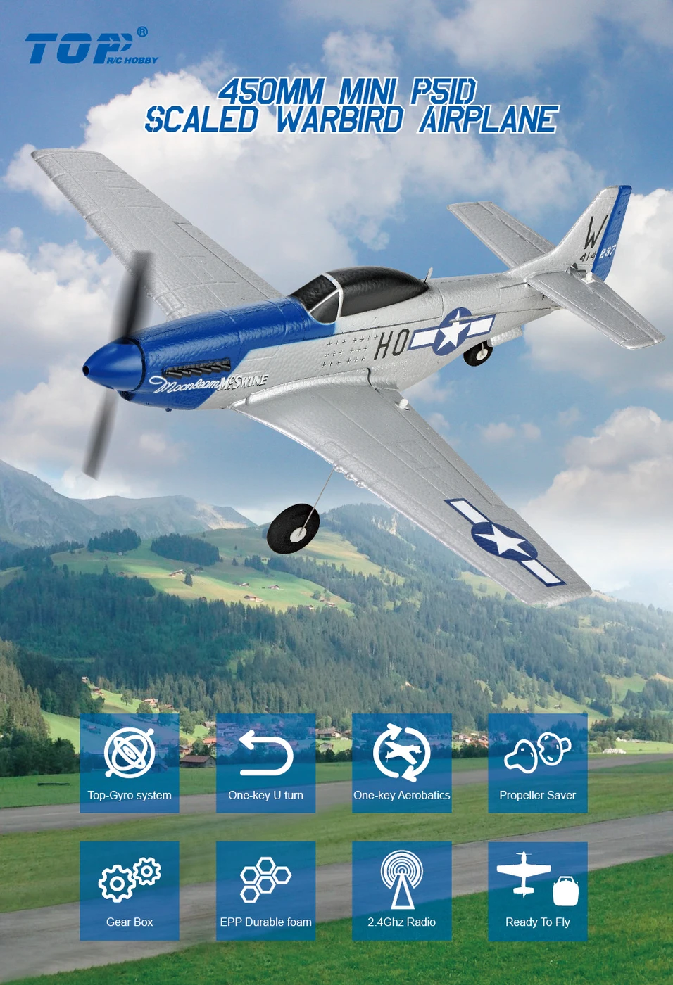 טיסן חשמלי TOP-RC מוטות כנפיים 450 ממ ארבעה ערוצים מוכן להטסה כנף תחתית דגם מוסטנג P-51D.