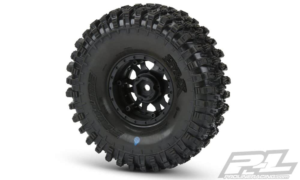 PRO LINE HYRAX 1.9" ROCK TERRAIN TRUCK TIRES MOUNTED ON IMPULSE BLACK BEAD-LOC WHEELS- MADE IN THE USA