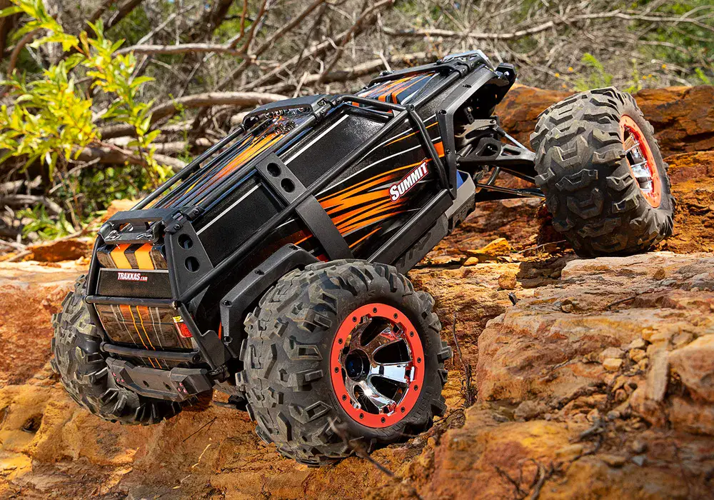 טרקסס סאמיט 4X4 מאנסטר טראק מוכנה לנסיעה בגודל 1/10 בצבע כתום. רכב שטח אוטלמטיבי מגיע עם הנעה 4X4 נעילות דפרנציאלים ומערכת שני הילוכים לכוח ולמהירות.