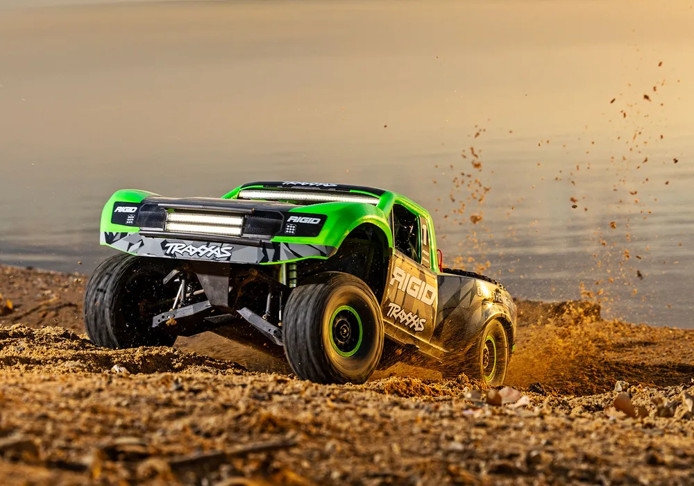 רכב טרקסס UDR החדשה דזרט רייסר 4X4 בראשלס חשמלית מוכנה לנסיעה בגודל 1/7 ירוקה , רכב עוצמתי 4X4 מופעל ע"י מערכת בראשלס עוצמתית המסוגלת להטיס את חיית השטח הזו למהירות של למעלה מ-80 קמ"ש , הרכב UDR בעל מראה מהמם ראליסטי לרכב האמיתי כמו כן ה-UDR בנוי על אותו קונספט מה שמקנה לו התנהגות שטח יוצאת מן הכלל בתנאי שטח קשים ומאתגרים , ה-UDR החדשה דזרט רייסר מגיע עם תאורה קדמית ואחורית.